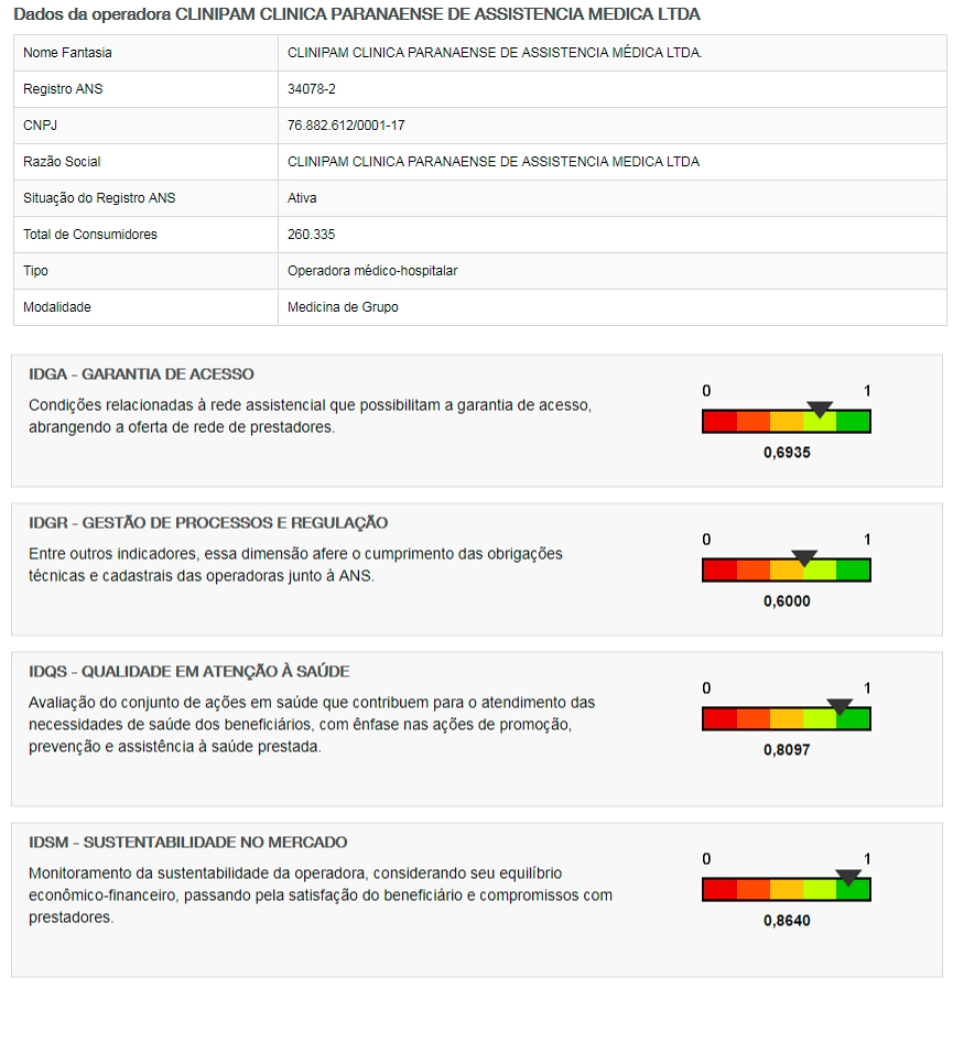 A Agência Nacional de Saúde Suplementar (ANS) publicou o resultado final do Programa de Qualificação das Operadoras 2017 (ano-base 2016). A Clinipam mais uma vez se destaca como empresa recomendada, o IDSS da operadora está na faixa 4 com pontuação de 0,7418, bem próximo a faixa de pontuação máxima da classificação, em uma escala de 0 a 1. Nesta mesma escala a dimensão Qualidade em Atenção à Saúde, ficou com a pontuação de 0,8097. Já no item Sustentabilidade no Mercado a Clinipam atingiu a nota de 0,8640, que é um reflexo da qualidade de atendimento aos nossos mais de 270 mil beneficiários.
