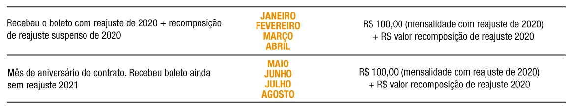 Os exemplos acima são meramente ilustrativos, com o objetivo de facilitar a compreensão quanto à forma de desconto da mensalidade retroativa dos contratos que tiveram reajuste.