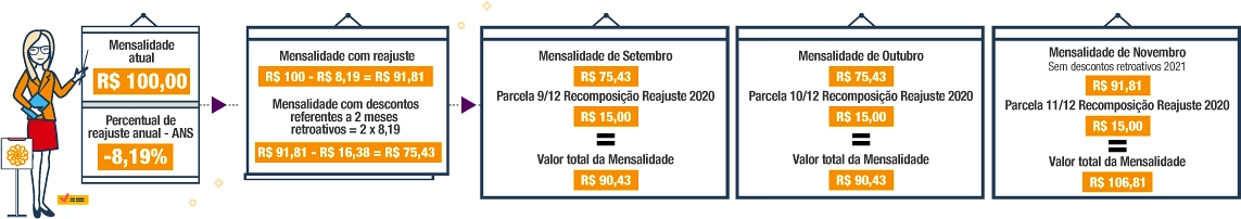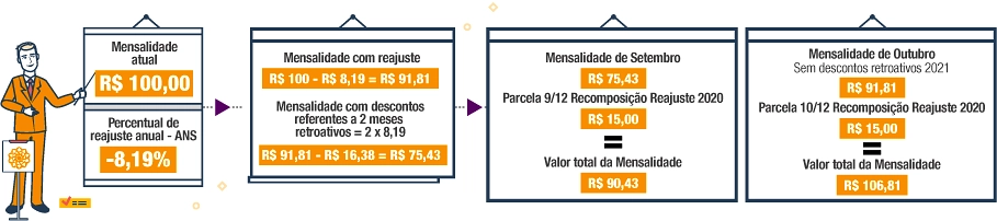 Em setembro, o beneficiário receberá a nova mensalidade reajustada, incluindo os descontos retroativos referentes aos meses de maio e junho e, em outubro, receberá os descontos retroativos referentes a julho e agosto. A partir de novembro, as parcelas seguem com o reajuste 2021 e as parcelas devidas da recomposição do reajuste 2020.